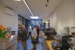 Na de rondleiding voorzag onze barista Simon iedereen van een heerlijk kopje Maeskes Roem koffie, vers gezet op zijn Kaffee Velo.